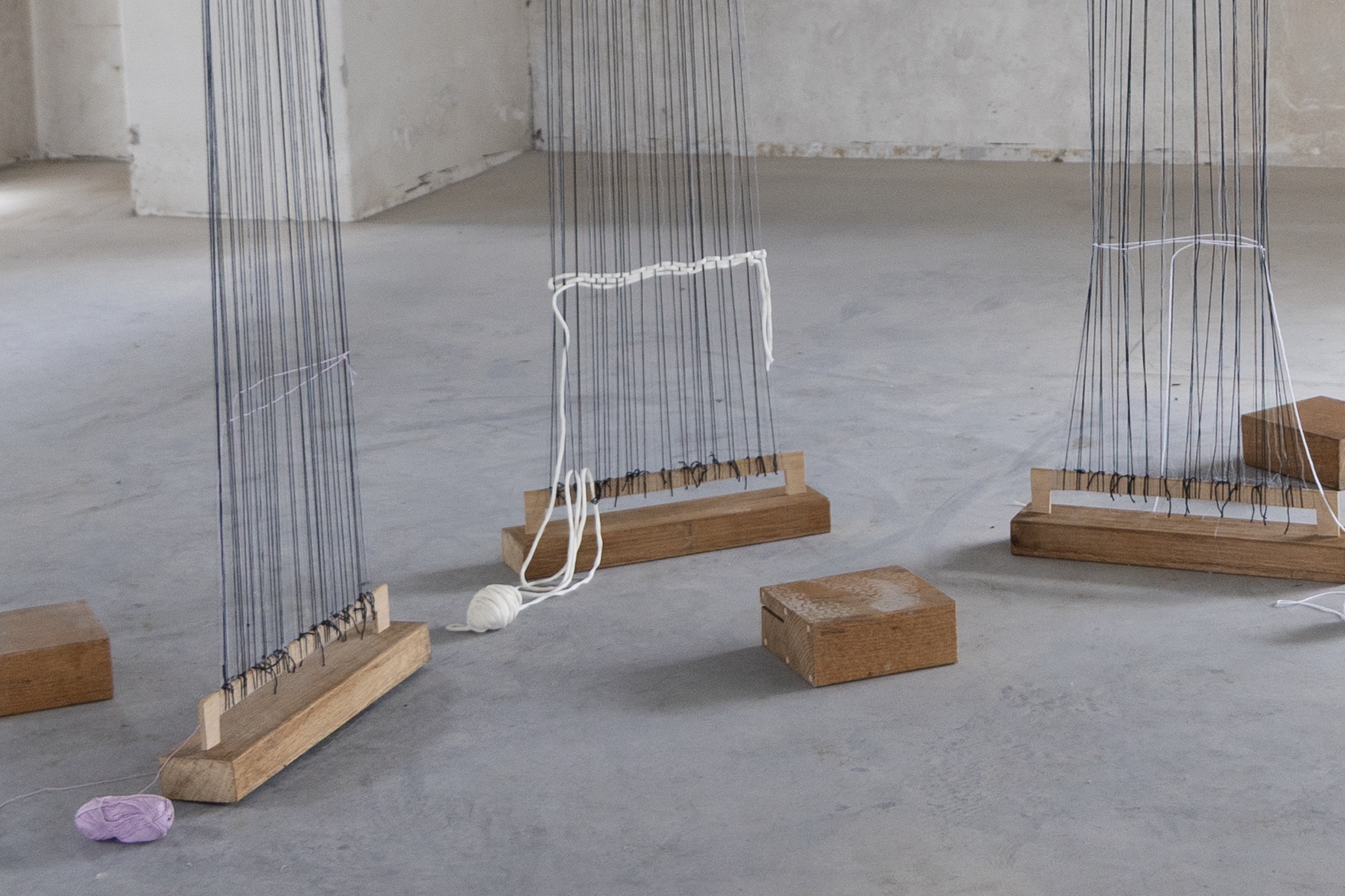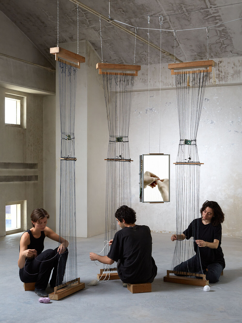 born under thread investigates the relationship between textile-making and computational logic through a network of looms connected to Raspberry Pi microcomputers. Each touch on the conductive yarns generates data that weaves itself into live visual and sonic patterns, approaching computation as an embodied, relational process. At its core, this project aims to pull computation down from the cloud and return it to the collective.